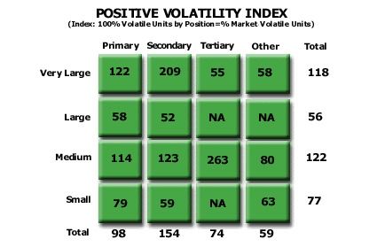 These positive Volatility levels reflect the types of market innovations that dominate the tactics of the market’s successful Suppliers. New function and price innovations by Suppliers characterize a fast-growing market. These innovations usually have high value for both existing Buyers and new entrants. These innovations enable the innovating Suppliers to win market share with positive Volatility.