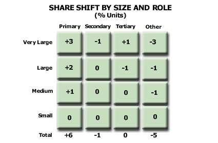 A Hostile market usually sees shares consolidating in the Primary and Secondary Role segments with the Very Large and the Large Buyers. These four segments make up the heart of the market, where any aspiring market leader must excel.