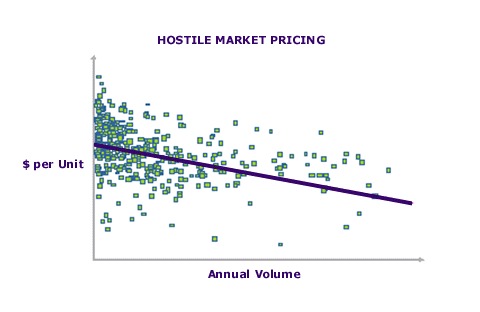 Pricing in a Hostile marketplace is chaotic compared to a less intensely competitive, normal, market. A normal market will often see market pricing discipline where unit price falls predictably depending on the Size of the Buyer’s purchases. This discipline is nonexistent in a Hostile marketplace. On average, Hostile market prices do decline with the increasing Size of a Buyer. However, virtually every Buyer negotiates a unique price. These prices, and resulting profit margins, often vary widely both within any Buyer Size segment as well as across Size segments.